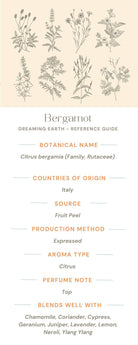 Botanical Name: Citrus bergamia Origin: Italy Family: Rutaceae Aroma: Light, fruity, citrus Perfume Note: Top Method of Extraction: Cold Expression Source: Fruit peel Main Chemical Components: Limonene, linalyl acetate, linalol, pinene Blends Well With: Chamomile Roman, Coriander, Cypress, Geranium, Lavender, Lemon, Neroli, Ylang Ylang