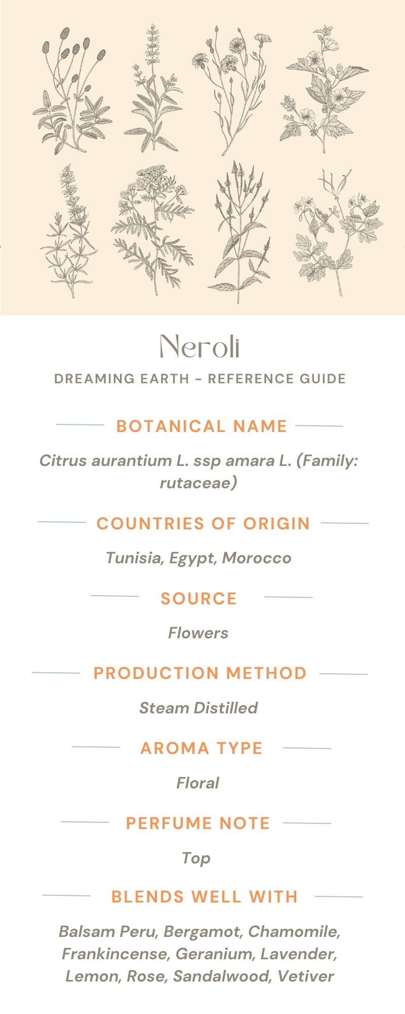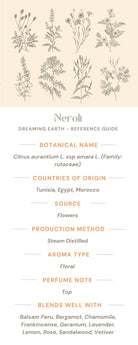 Botanical Name: Citrus aurantium L. ssp amara L. Origin: Egypt Family: Rutaceae Aroma: Floral, sweet, spicy Perfume Note: Middle Method of Extraction: Steam distilled Source: Fresh flowers Main Chemical Components: Linalol, linalyl acetate, limonene, pinene, geraniol Blends Well With: Citrus oils, Rose, Jasmine, and Ylang Ylang. For a really luxurious blend, mix with Rose Absolute and Jasmine Absolute oils.